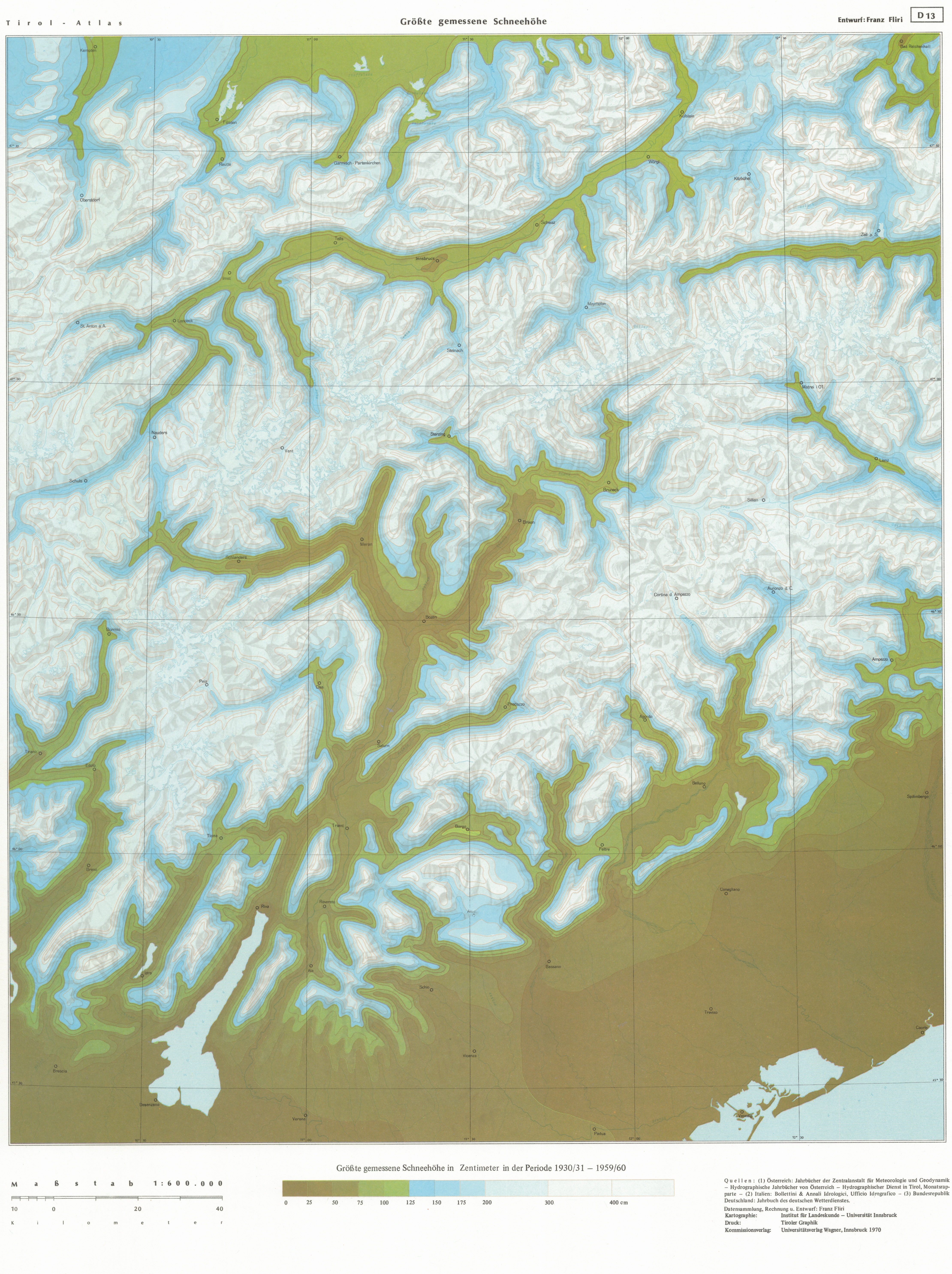 D13. Größte gemessene Schneehöhe (1:600.000)