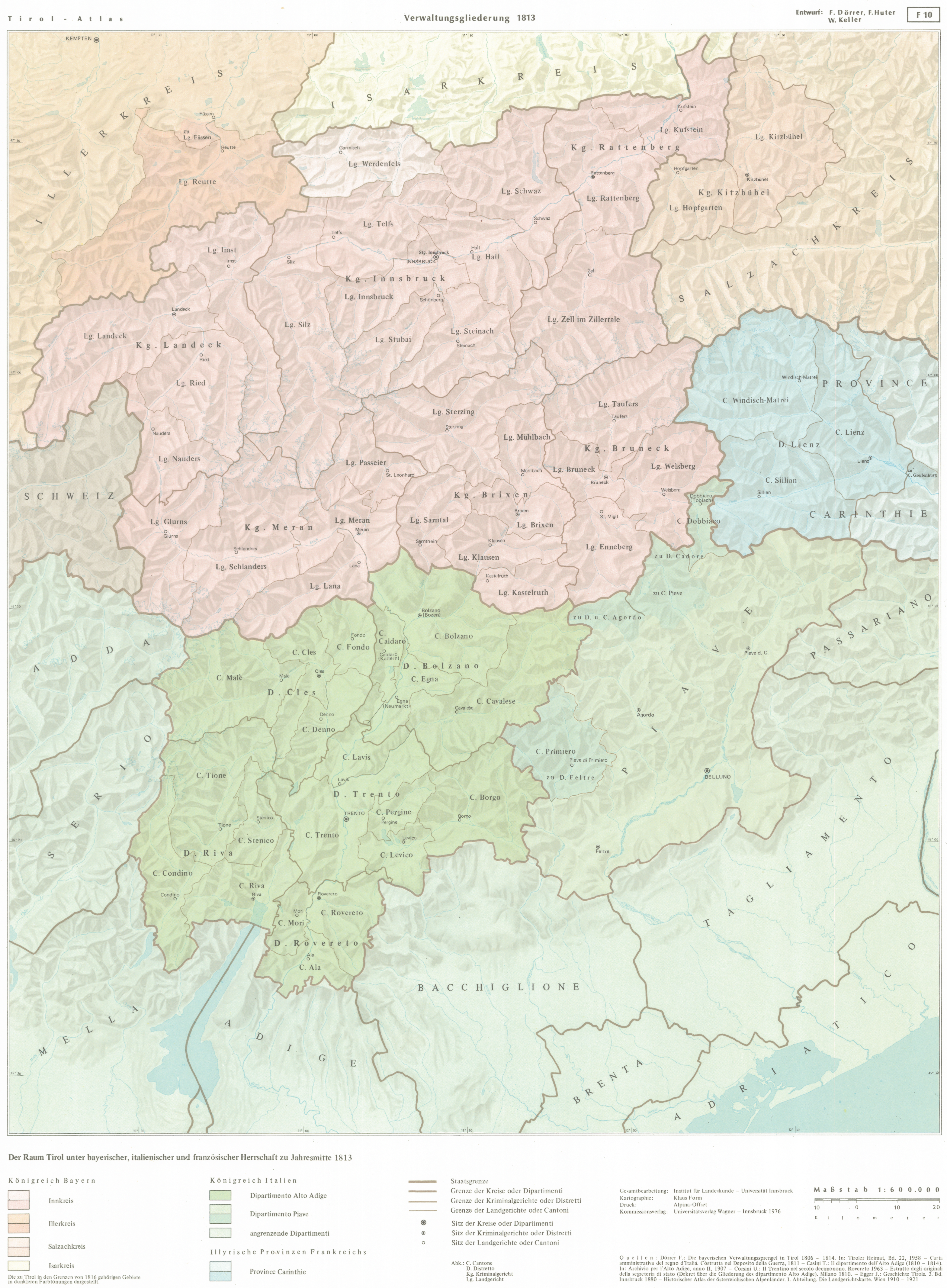 F10. Verwaltungsgliederung: Der Raum Tirol unter bayerischer, italienischer und französischer Herrschaft zu Jahresmitte 1817 (1:600.000)