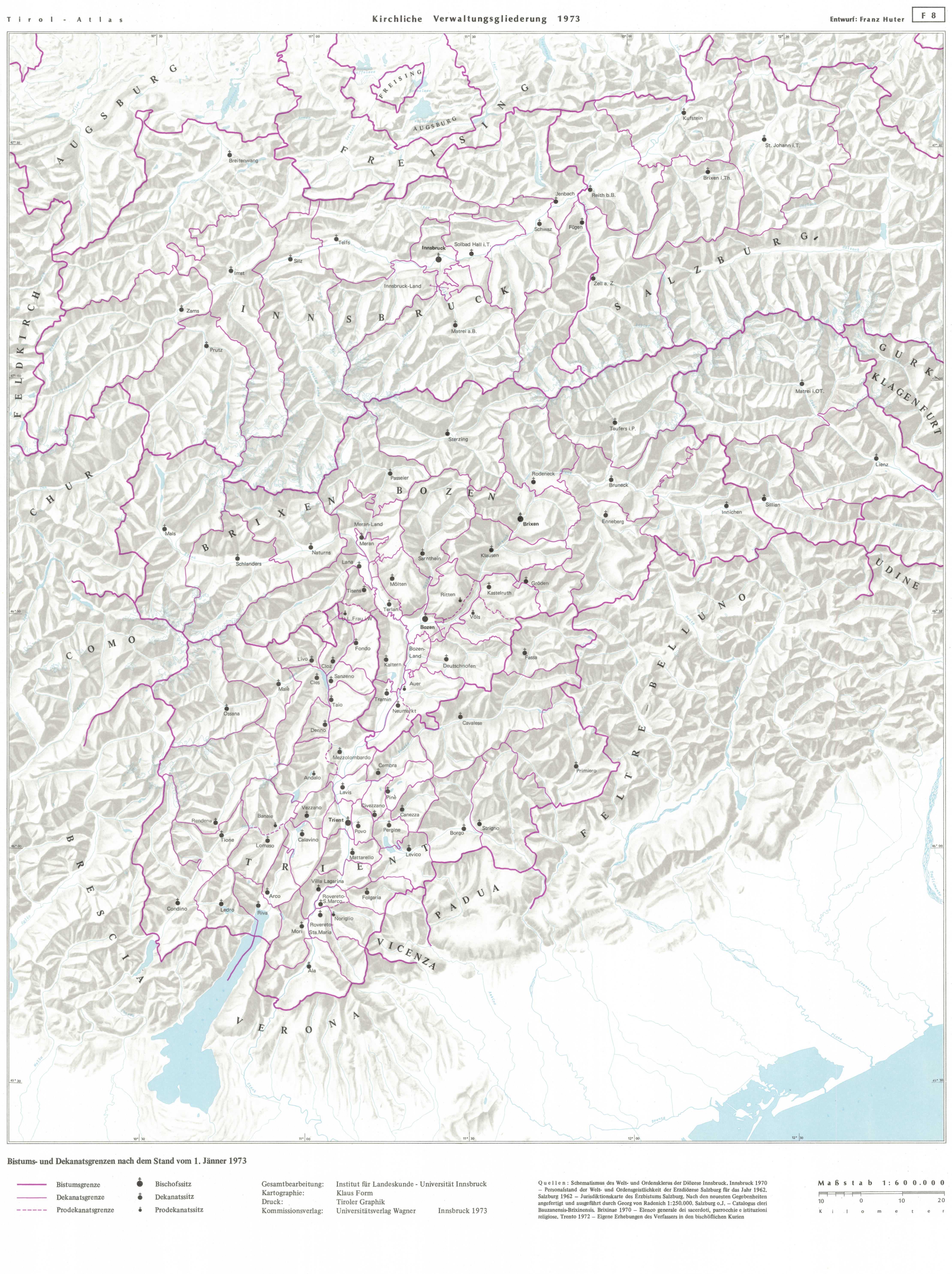 - Begleittext: Franz Huter: Kirchliche Verwaltungsgrenzen: Bistums- und Dekanatsgrenzen nach dem Stande 1. Jänner 1973. In: Tirol Atlas Begleittexte I, S.18-20, Innsbruck 1974.