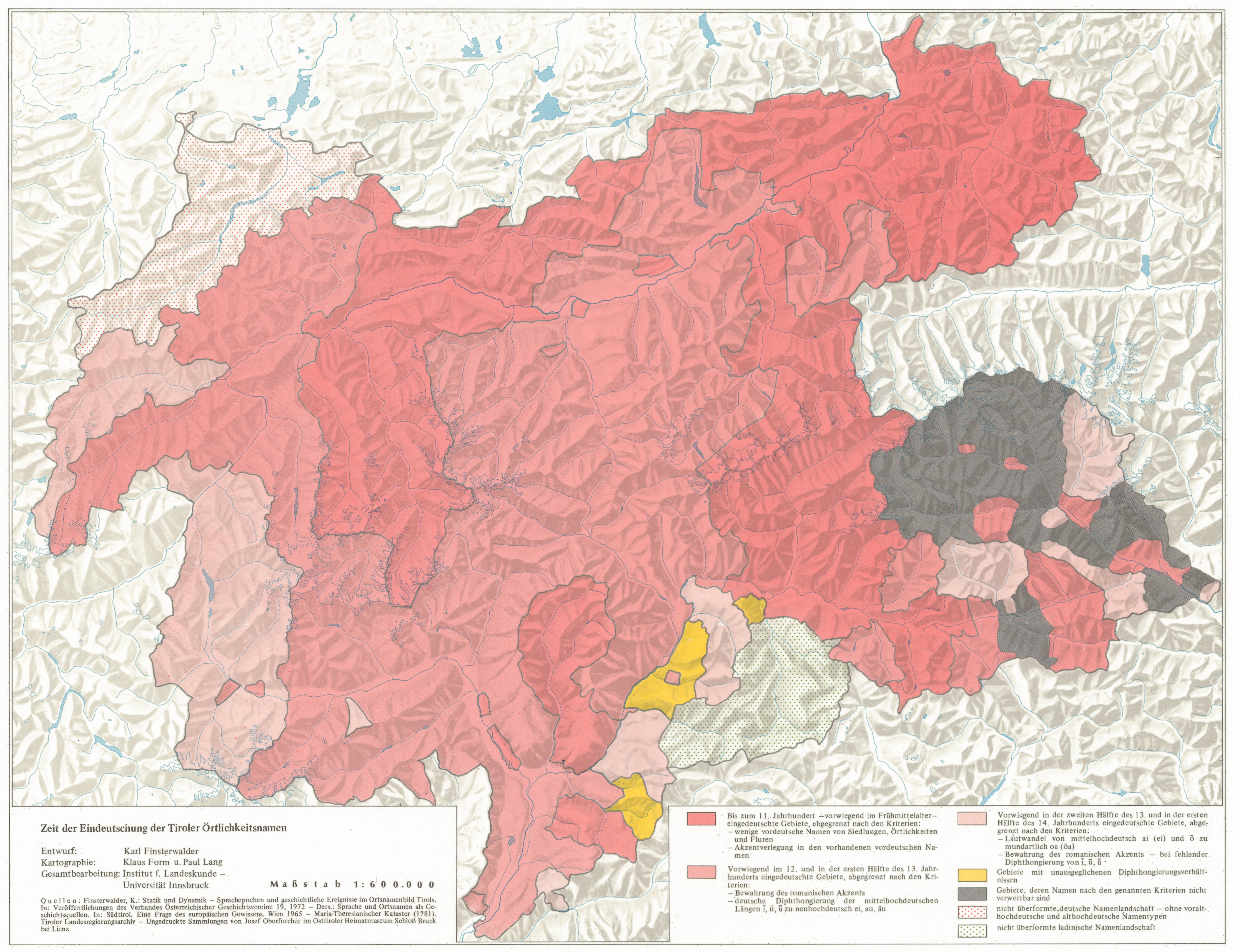 - Begleittext: Karl Finsterwalder: Die Ortsnamen in Tirol. In: Tirol Atlas Begleittexte II, S.28-37, Innsbruck 1975.