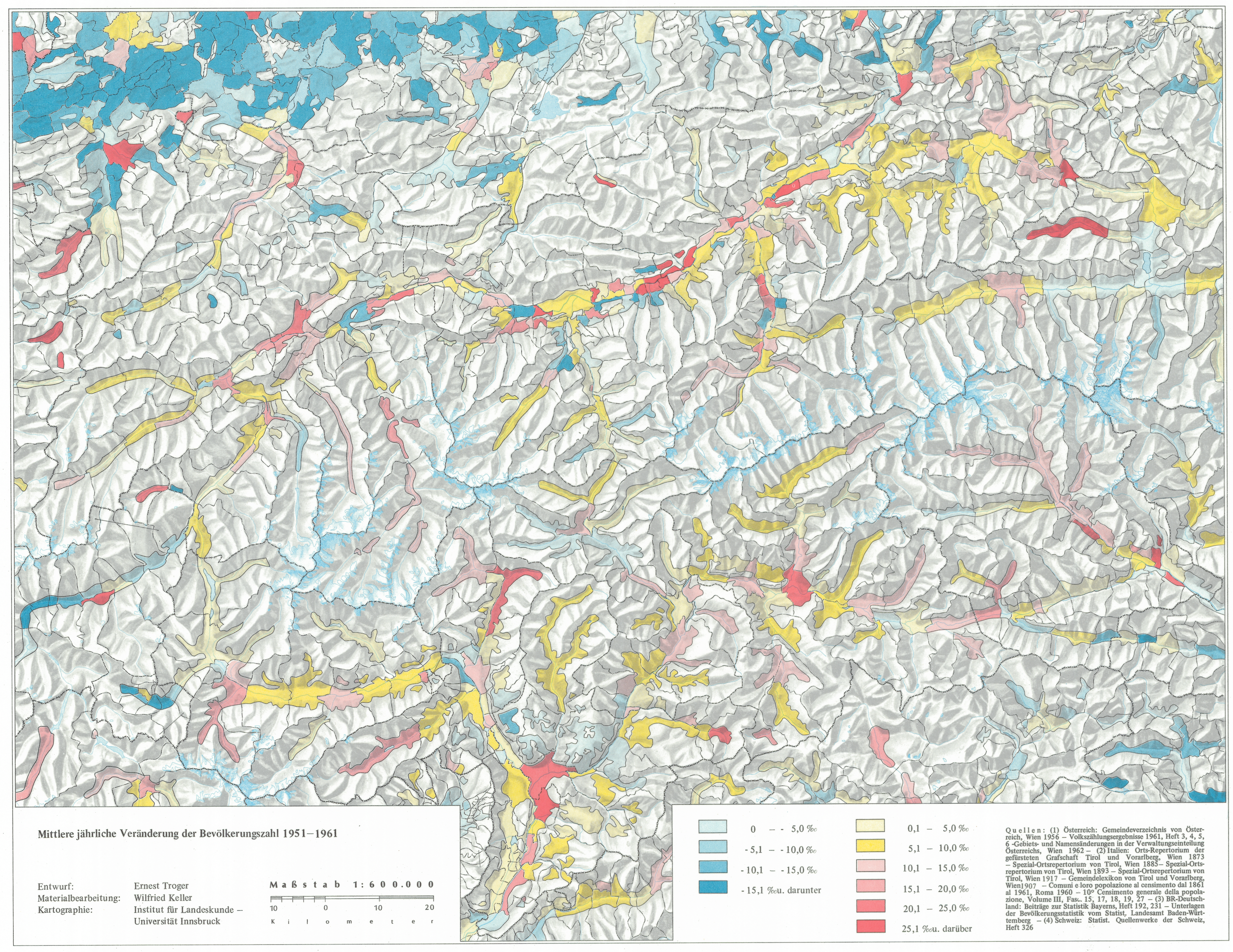- Begleittext: Wilfried Keller: Bevölkerung - Verteilung, Entwicklung, Gliederung. In: Tirol Atlas Begleittexte I, S.30-31, Innsbruck 1974.