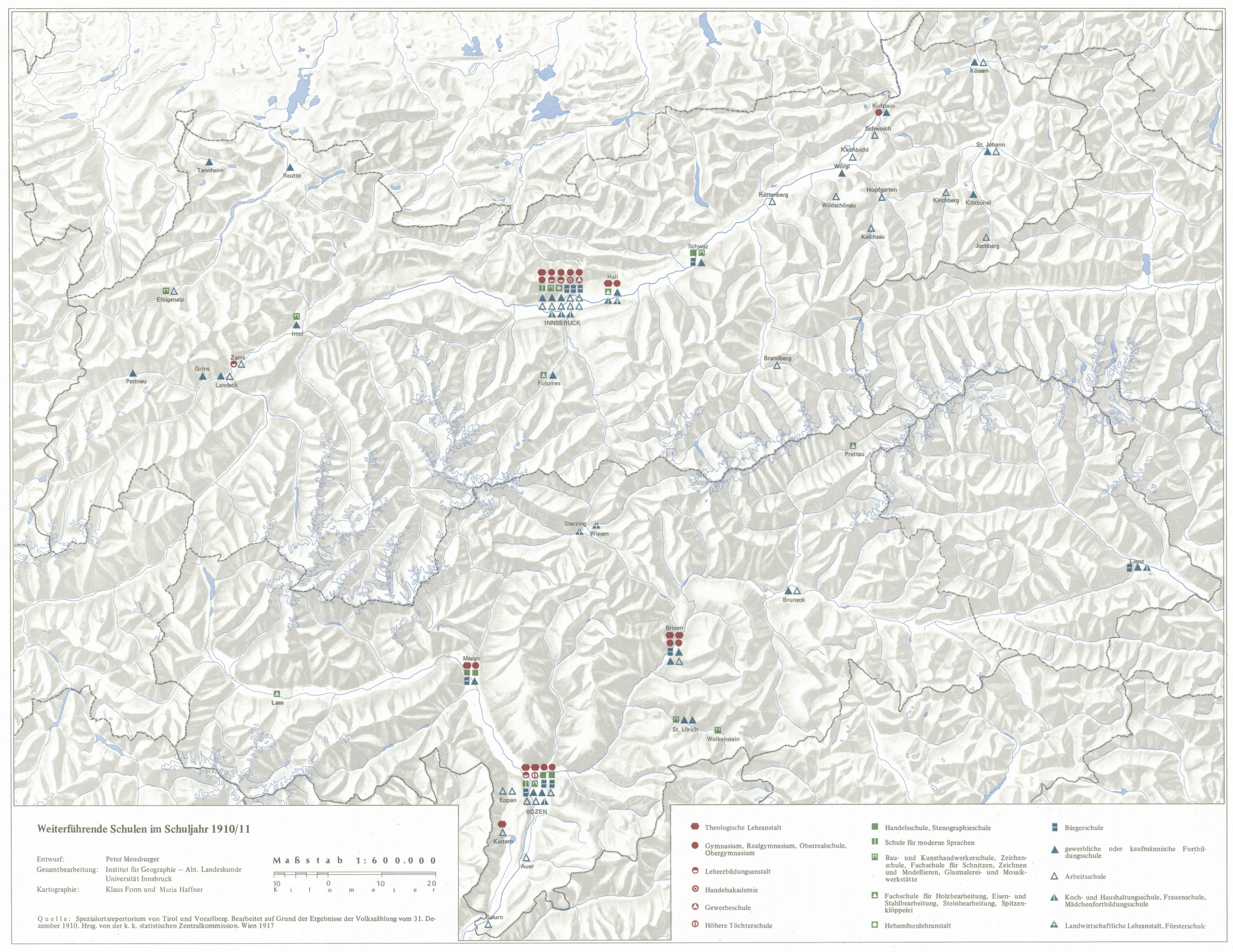 - Begleittext: Konrad Höfle, Peter Meusburger: Kindergärten und weiterführende Schulen. In: Tirol Atlas Begleittexte VIII, S.56-59, Innsbruck 1983.